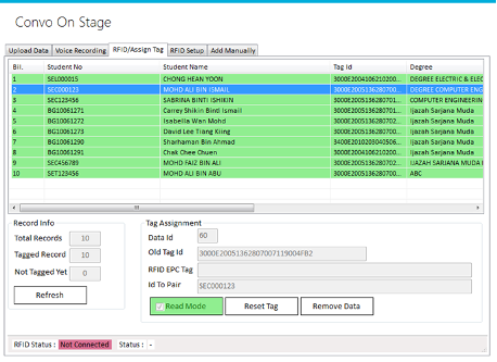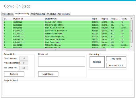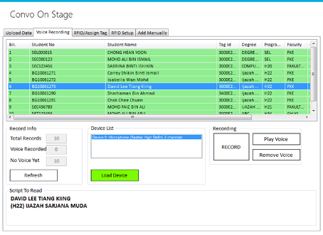 The Convo On Stage system is a graduation queue system specifically designed to assist universities and colleges in managing the process of recognizing graduates during graduation ceremonies. It streamlines the arrangement of graduates as they receive their honors on stage. The system utilizes Ultra High Frequency (UHF) RFID technology to ensure accuracy and efficiency. Here's how it works: